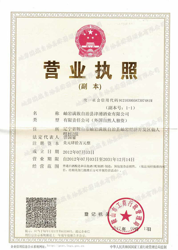 岫巖滿族自治縣津湧酒業(yè)有限公司位于風(fēng)景秀麗、青山綠水的岫巖縣前營鎮(zhèn),公司占地3500平方米,年生產(chǎn)能力100噸釀造醬香原漿白酒。2013年公司產(chǎn)品“津湧豪酒”曾獲得遼寧省“遼寧放心名酒”稱號,公司現(xiàn)正研發(fā)配制酒生產(chǎn)項目,為公司發(fā)展提供技術(shù)保證。公司的注冊資本全部由美籍華人出資。